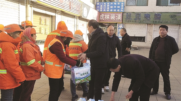 本报讯 近日,交口县桃红坡镇天寒地冻,朔风凛冽,而位于步行街的定理文化广场却是欢声笑语,暖意融融。该镇康禽农场总经理、县政协委员王梁在此举行“冬日送温暖,情系环卫工”活动,现场将90箱富硒鸡蛋免费赠送全镇环卫工人,为冬日的街头增添一抹暖意。