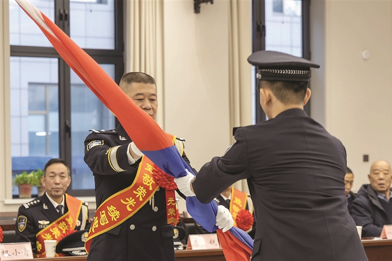 表彰与传承紧密相连。在授旗仪式环节,荣退民警将象征着责任与使命的旗帜郑重交予新入警民警手中,全体新警面向旗帜庄严宣誓,誓言铿锵有力,彰显了传承忠诚使命、续写公安荣光的坚定决心。新入警代表在表态发言中表达了立足新岗位、勇担新使命的奋进姿态;荣退民警代表深情回顾了从警生涯的难忘历程,分享了宝贵工作经验,并围绕全市公安工作高质量发展提出了中肯的意见建议。