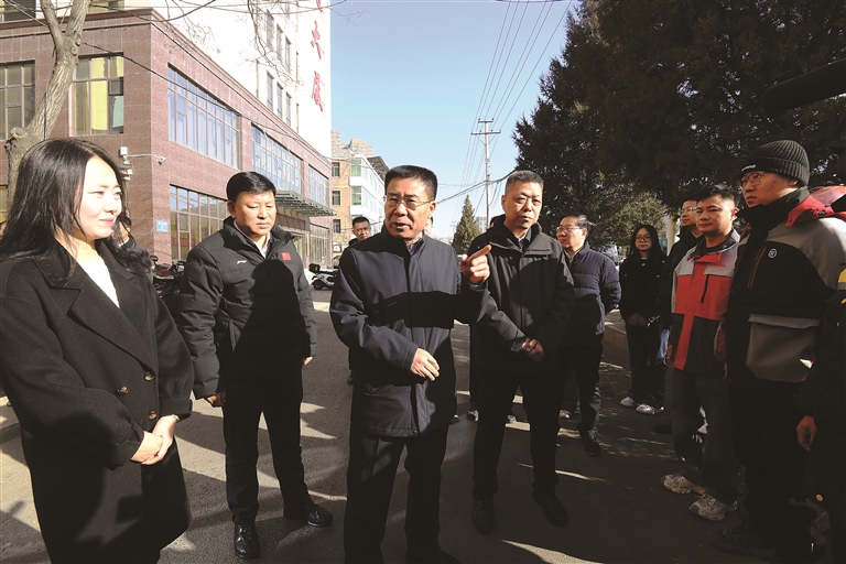 在离石区城北街道尉汾路社区,孙大军查看党群服务中心、“志愿吕梁”驿站建设运行情况,与快递员、外卖员等新就业群体和志愿者代表交流,了解他们的工作、生活情况,强调要建好用好“志愿吕梁”驿站,丰富党群服务中心便民服务项目,温暖劳动者,传递真善美,传播正能量。