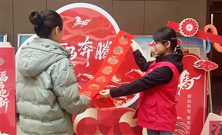 在这里,志愿者有的专注地协助书法老师研墨铺纸,有的小心翼翼地将刚写好的吉祥春联和饱满的“福”字一一整理、摊开晾晒。当一幅幅满载深情祝福的对联被递到游客手中时,惊喜的笑容在游客脸上绽放:“太感谢了!逛博物馆还能领到这么有意义的春联!”