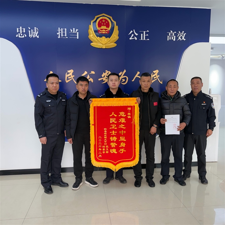 本报讯 (文/图 记者 刘华) “多亏了姜镇不顾安危救火,保住了我们村的造林地,这份恩情我们永远记在心里!”2月27日一大早,临县城庄镇太平村党支部书记郭青峰带领村“两委”干部,手持一面印着“危难之中显身手 人民卫士铸警魂”的锦旗,专程来到吕梁市公安局离石分局刑事侦查大队,将锦旗送到民警姜镇手中,朴实的话语里满是感激,鲜红的锦旗在晨光中熠熠生辉,定格下一段警民同心的温暖瞬间。