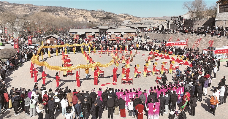 本报讯 中国年,碛口味,沿着黄河看临县。新春佳节,碛口古镇迎来了四面八方的游客,不少外国友人也专程前来过大年。黑龙庙下的文化广场上,一场场年味浓郁、形式多样的非遗文化展演轮番上演,为市民游客奉上了丰盛的“新春文化大餐”,整座古镇沉浸在喜庆祥和的节日氛围中。2026年马年春节,临县的城区、农村社区及各大景点张灯结彩、欢声笑语,新春氛围格外浓厚。当地推出的传统民俗文艺演出、非遗文化展演、年货大集、农特优产品展销等活动,让广大市民和外地来临县过年的游客,在喜庆热闹的氛围里赏花灯、扭秧歌、品美食、观夜景,感受别样的节日特色,度过了一个称心如意的“平安幸福年”。