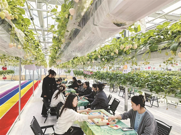 在园区配套的大厅里,本地特色小吃香气扑鼻,游客们采摘间隙在此休憩补给。“我们打造的是‘农业+文旅’融合模式,让游客既能品尝优质草莓,又能享受休闲时光。”东盘粮村村党支部书记范忠介绍,作为全国乡村治理示范村,该村坚持深耕“三产融合”战略,通过智能化改造让传统农业焕发新生,空中草莓园是村里设施农业升级的一部分,未来还将继续拓展研学、团建等功能,让科技农业成为乡村旅游的新亮点。