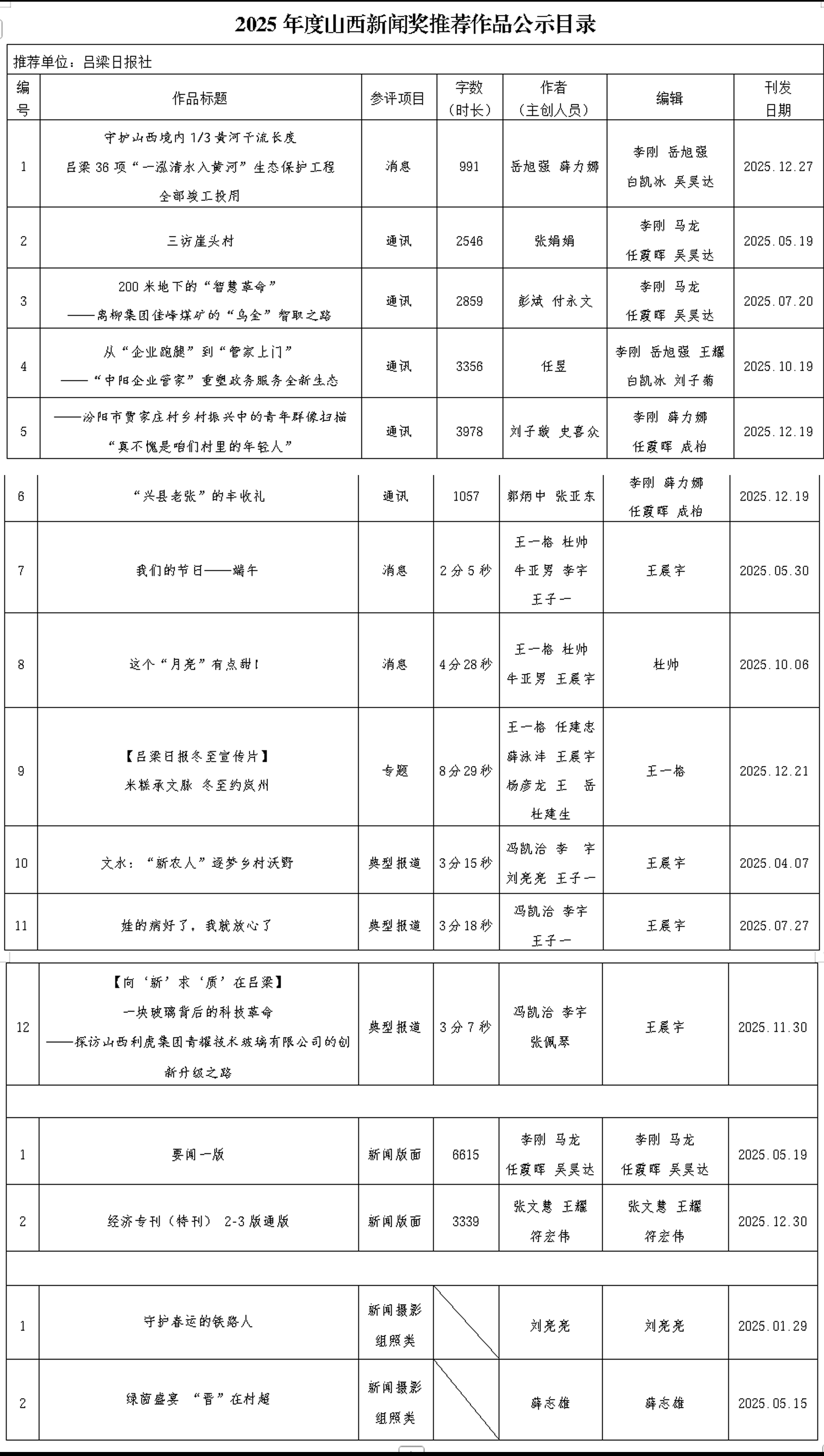吕梁日报社2025年度山西新闻奖推荐作品公示目录