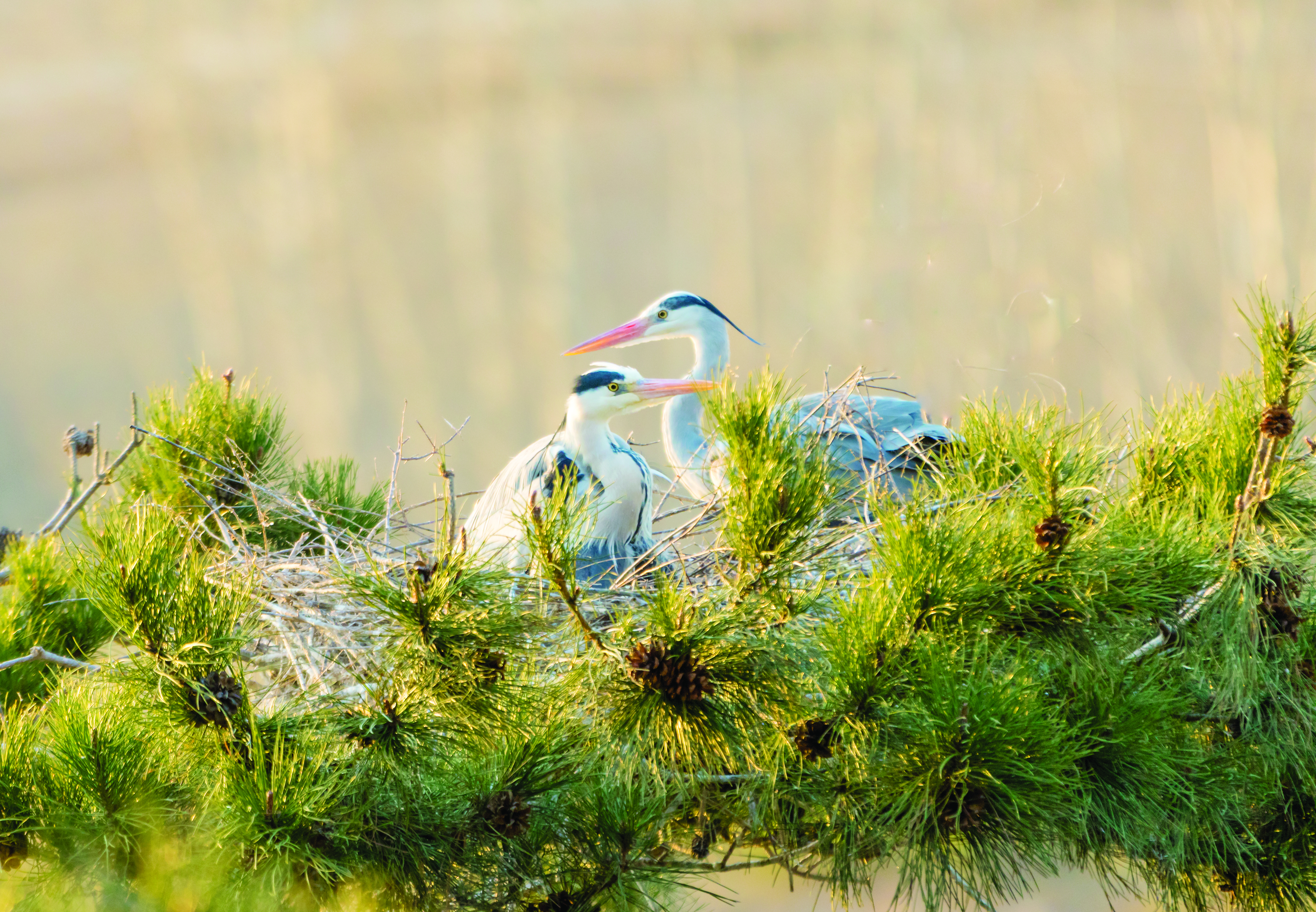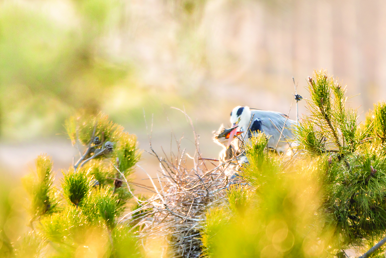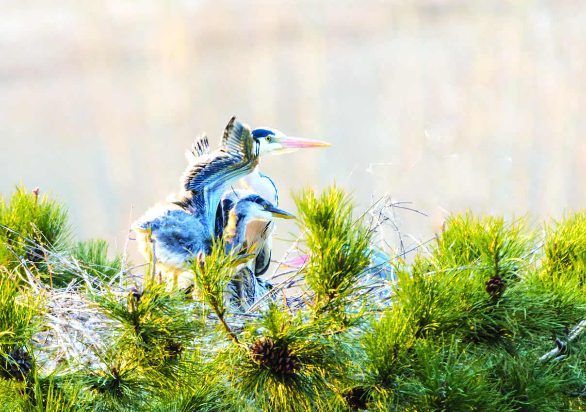 苍鹭又称灰鹭,属国家二级保护动物,是一种较为大型的水鸟类,经常栖息于湿地、湖泊等水域边,它们大多四只一窝,与一对“鸟父母”群居生活,以河湖中的小鱼为生。