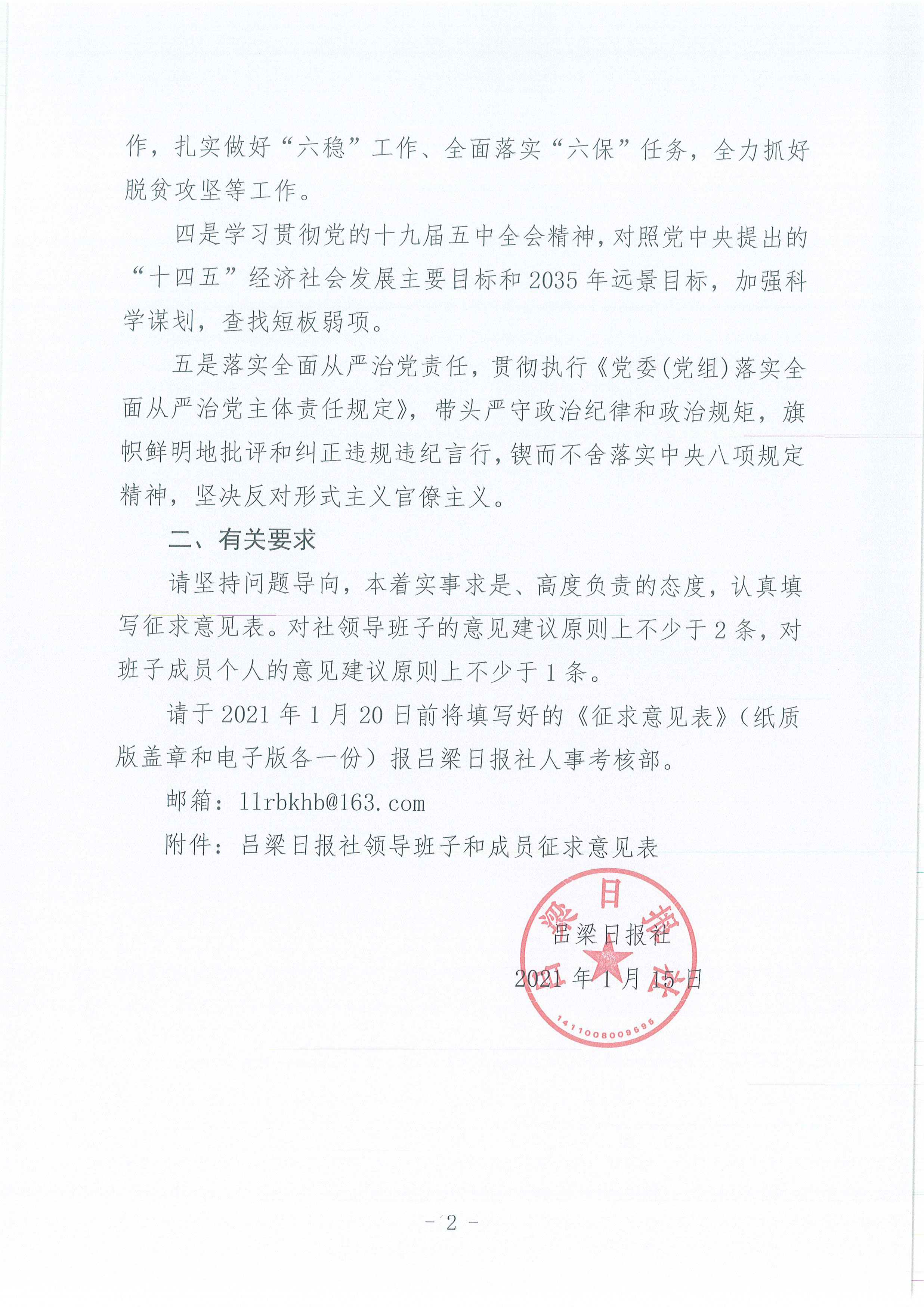 关于2020年度吕梁日报社领导班子民主生活会征求意见的通知