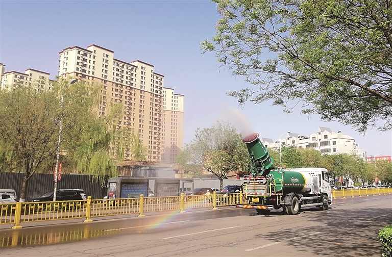 图为“雾炮车”正在汾阳市城区主干道喷射水雾,有效降低扬尘污染,增加空气湿度,改善城市环境质量。 李勇斌 摄